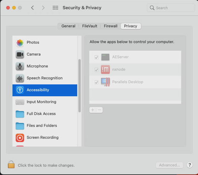 Wahrscheinlich fehlt eine Berechtigung in den Systemeinstellungen. Gehen Sie zu "System Settings" -> "Security & Privacy" auf den Tab "Privacy" und kontrollieren ob die Berechtigung bei "AEServer" und "nxnode" gesetzt ist.