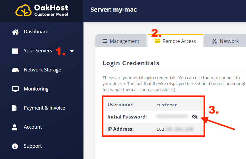 - Gehen Sie zum OakHost Kundenpanel und navigieren Sie zu Ihrem Mac. Dort finden Sie die IP-Adresse, den Benutzernamen und das Passwort für Ihren Mac.