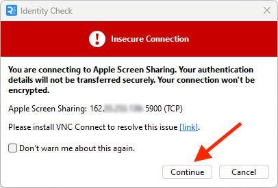 - Eine Benachrichtigung wird angezeigt, die darauf hinweist, dass die Verbindung unverschlüsselt ist. Wenn Sie die kostenlose Version verwenden, klicken Sie auf "Fortfahren". Für fortgeschrittene Benutzer empfehlen wir die Verwendung eines SSH-Tunnels zur Verschlüsselung der Verbindung. Anweisungen dazu finden Sie unten.
