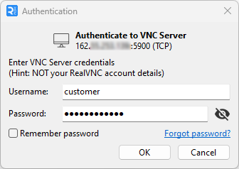 Dieser Fehler bedeutet in der Regel, dass Ihre Anmeldedaten nicht korrekt sind. Bitte beachten Sie, dass der Benutzername und das Passwort nicht Ihre RealVNC-, Windows- oder OakHost-Anmeldedaten sind. Der Benutzername und das Passwort für Ihren Mac finden Sie im Kundenpanel, wie oben beschrieben. Wenn Sie das Passwort Ihres Mac-Kontos geändert haben, verwenden Sie das neue Passwort.