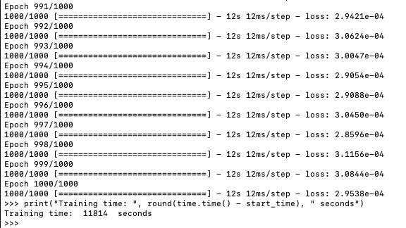 Für seine Spezifikation ist das Ergebnis nicht übel, aber eigentlich habe ich mir mehr von dem neuen Chip erwartet. Trainingszeit bei 1000 Epochen war 11814 Sekunden. Anscheinend gibt es noch etwas Optimierungsbedarf, was große Trainigssets angeht. Die gleiche Erfahrung wurde in diesem Blog auch gemacht: https://medium.com/analytics-vidhya/m1-mac-mini-scores-higher-than-my-nvidia-rtx-2080ti-in-tensorflow-speed-test-9f3db2b02d74