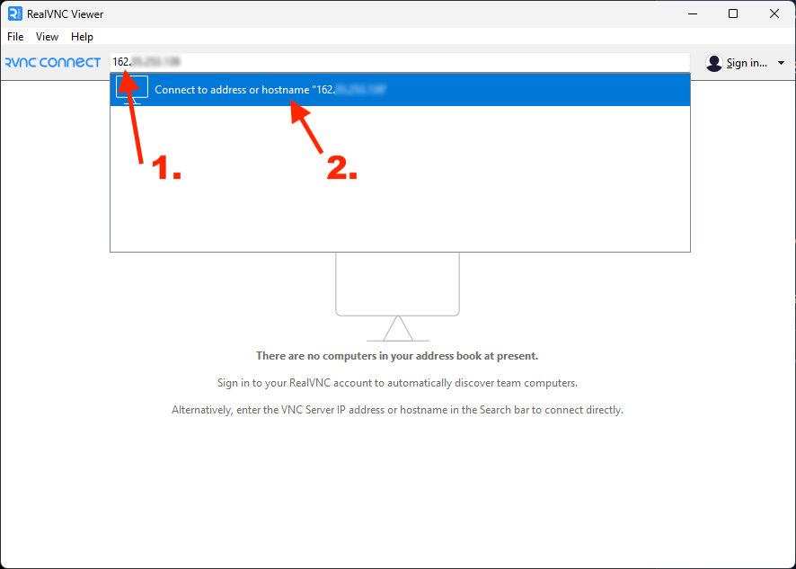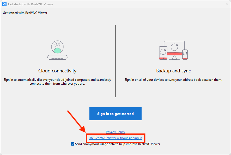 For now, click on "Use RealVNC Viewer without signing in". Of course, if you would like to create an account, you can do so as well, which allows for encrypted connections using the paid plan.