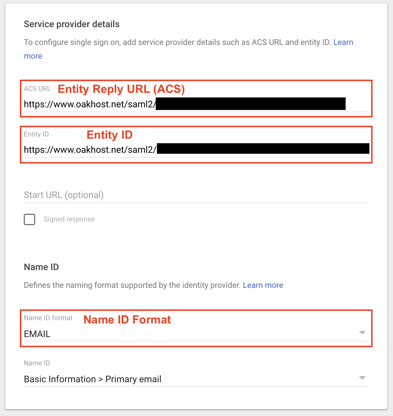 User Management>Manage SSO. - Copy the following values from the Google Identity Provider details page and paste them into the OakHost Customer Panel: